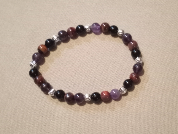 Bracelet is made with tiger's eye, onxy, and amethyst semi-precious stones. Tiger's eye helps to lift mood, increase motivation and overcomes lethargy, and heals mental disease and personality disorders. Onyx helps build self-confidence, promotes vigor and stamina, recognizes and integrates dualities within the self, and aids with self-control. Amethyst promotes emotional centering and dispells anger, rage, fear, and anxiety. Amethyst also helps to alleviate sadness and grief. Available in men's and women's sizes.