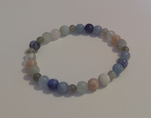 Made with 6mm stones and crystals. Aquamarine, Sunstone, Sodalite, Fluorite, and Labradorite all are said to increase intuition. Amazonite combines information passing through the brain with intuition. It is said to sooth emotional trauma and assists in manifesting universal love. Aquamarine is said to counteract forces of darkness and procure favor from the spirits of light, and it encourages taking responsibility for oneself. Sunstone is a joyful, light-inspiring stone that is said to lift dark moods and increase self-worth and confidence. Sodalite brings about emotional balance and calm while also instilling a drive for truth. Fluorite has a stabilizing effect on emotions and is also said to increase self-confidence. Labradorite helps to deflect unwanted energies from the aura and prevents energy leakage while also strengthening faith in self and trust in the universe.