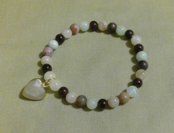 Made with rose quartz, garnet, rhodonite, and morganite, this bracelet is meant to assist in attracting love as well as sustaining current love connections. Made with 6 mm genuine semi-precious stones on an elastic cord, with rose quartz heart pendant. Available in one size (7.2")