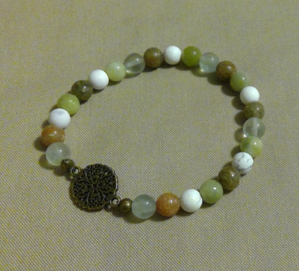 This lovely bracelet is made with unakite, green fluorite, white howlite, and green jade with a bronze colored floral medallion in the center. Made with 6 mm genuine stone beads on an elastic cord. The metaphysical qualities of the stones are meant to aid in spiritual connectedness and growth. Please allow for color variation due to nature of stones. Available in women's M (7") and L (7.25").